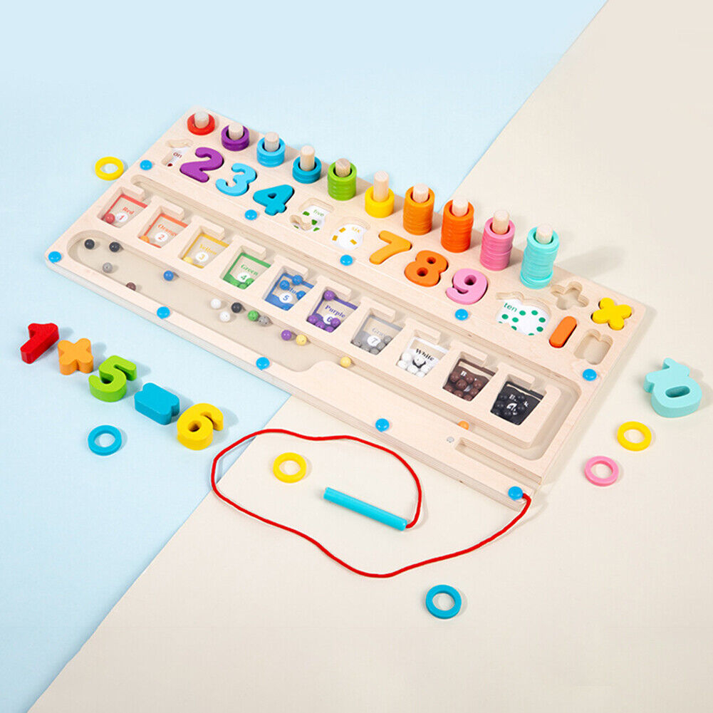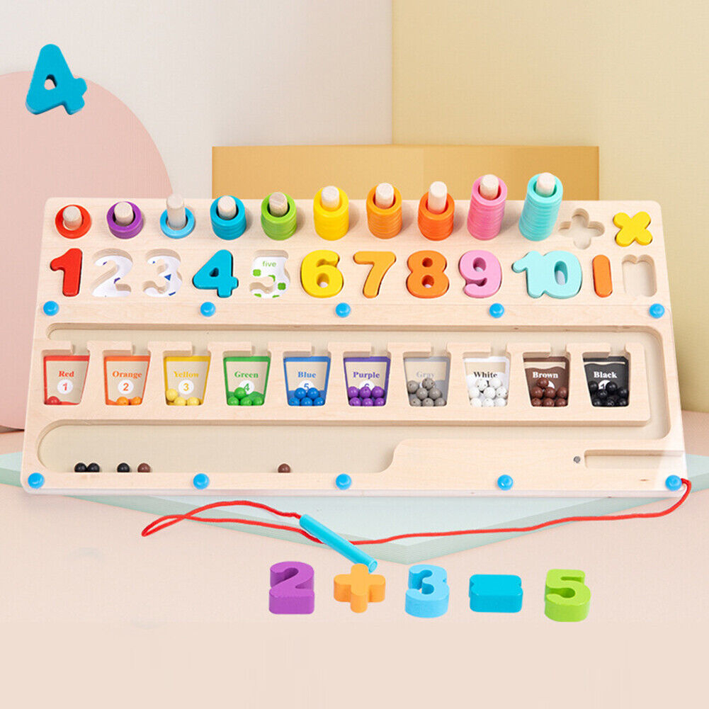 Acest puzzle cu numere din lemn pentru copii mici are dimensiunea ideala: 42 cm lungime, 21 cm latime, cu piese de puzzle usor de prins. Include o tabla magnetica din lemn pentru culori si numere, 55 de inele de numarare, 10 blocuri de numere si 4 simboluri matematice