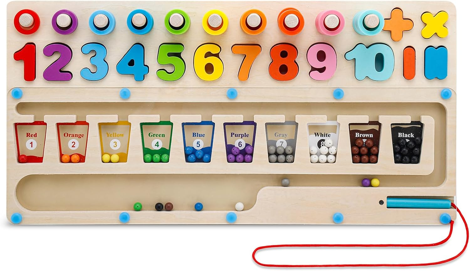 Acest labirint magnetic are un total de 10 culori, copiii pot invata sa recunoasca diferite culori. Exista margele de diferite culori care pot fi plimbate cu tija magnetica pana la canelura culorii corespunzatoare. Copiii pot invata clasificarea si pot promova capacitatea de practica.