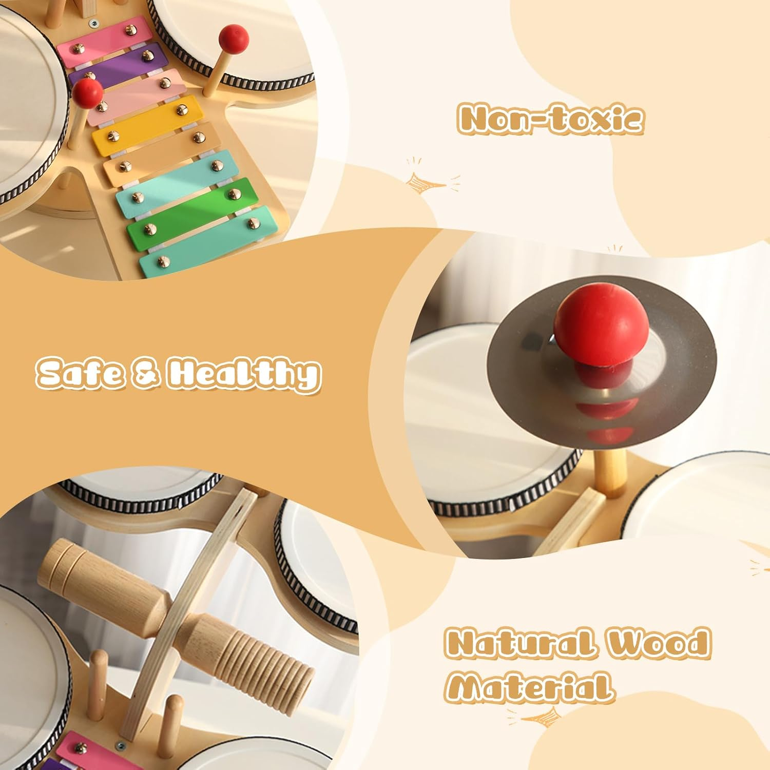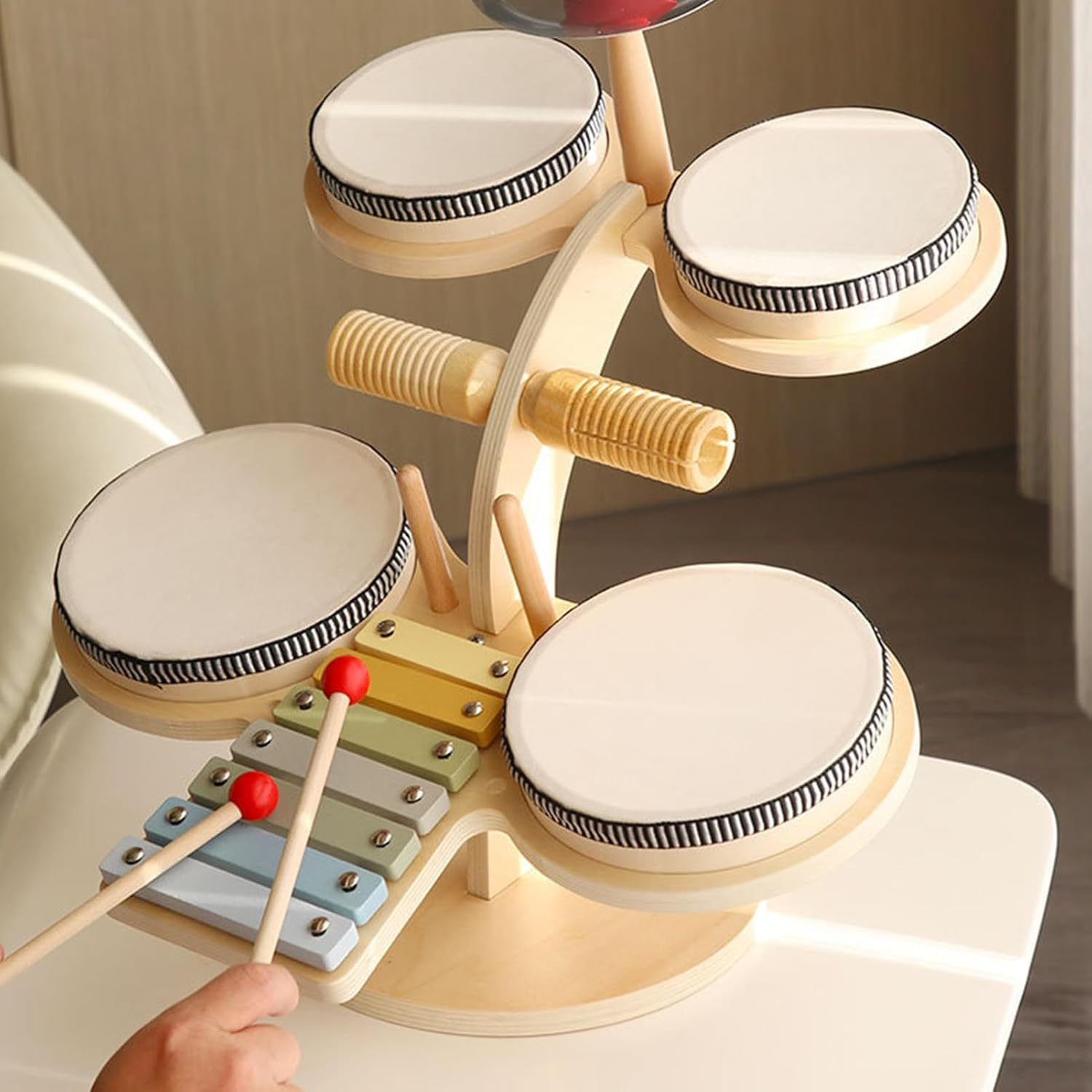 Set Muzical Montessori cu Tobe si Xilofon, Joynix, Lemn, Dimensiuni ideale